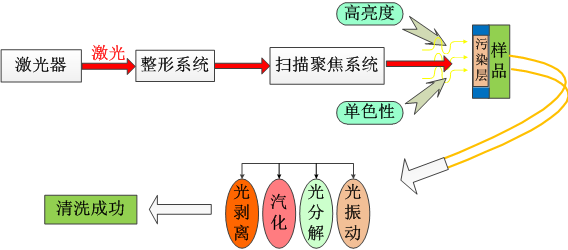 激光除銹是利用窄脈寬、高功率密度的激光作用于待清洗物表面,在快速光振動(dòng)、汽化、分解和等離子體剝離等機(jī)理的共同作用下,使污物脫離基底,實(shí)現(xiàn)表面清洗。目前,典型的激光清洗方法主要有三種:激光燒蝕清洗、液膜輔助激光清洗和激光沖擊波式清洗方法。在以上三種方法中,激光燒蝕清洗方法的操作條件簡(jiǎn)單,使用最為廣泛,選擇合適的激光器類型、采用優(yōu)化的工藝參數(shù)可去除各種涂層、油漆、顆粒或污物。其余兩種方法雖然也具有各自的優(yōu)點(diǎn),但目前應(yīng)用仍處于研究階段,沒(méi)有大規(guī)模推廣。